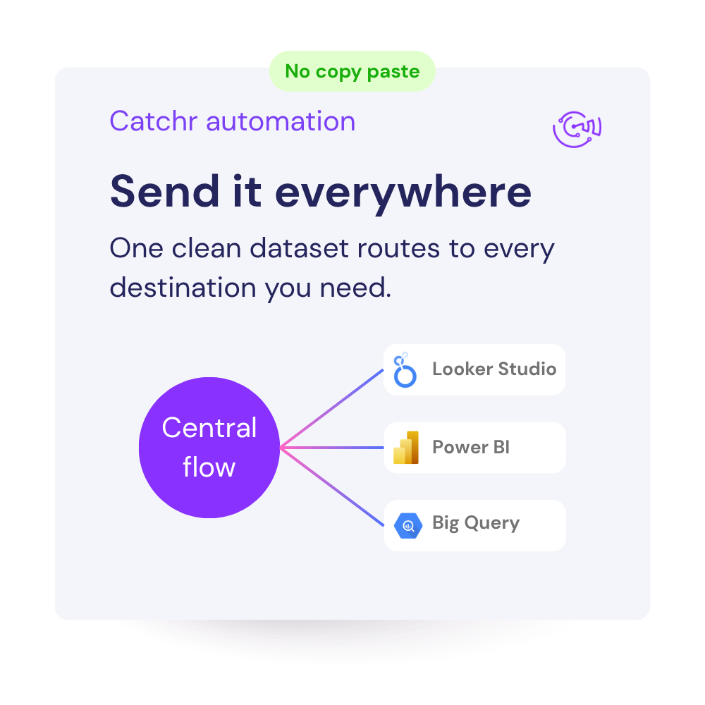 Catchr continuously ships clean, structured data to your chosen destinations such as Managed BigQuery, Catchr API, external warehouses, datalakes, Looker Studio, and Google Sheets. No manual exports, no copy paste, no chasing the latest file.