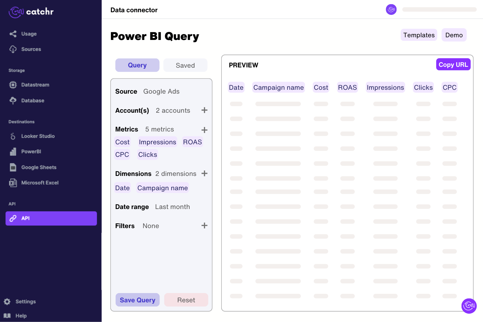 Catchr delivers marketing data from 80+ sources into Power BI. With an intuitive interface, pre-built queries, and always up-to-date data, you can automate and unify your data extraction. Focus on insights, not data preparation.