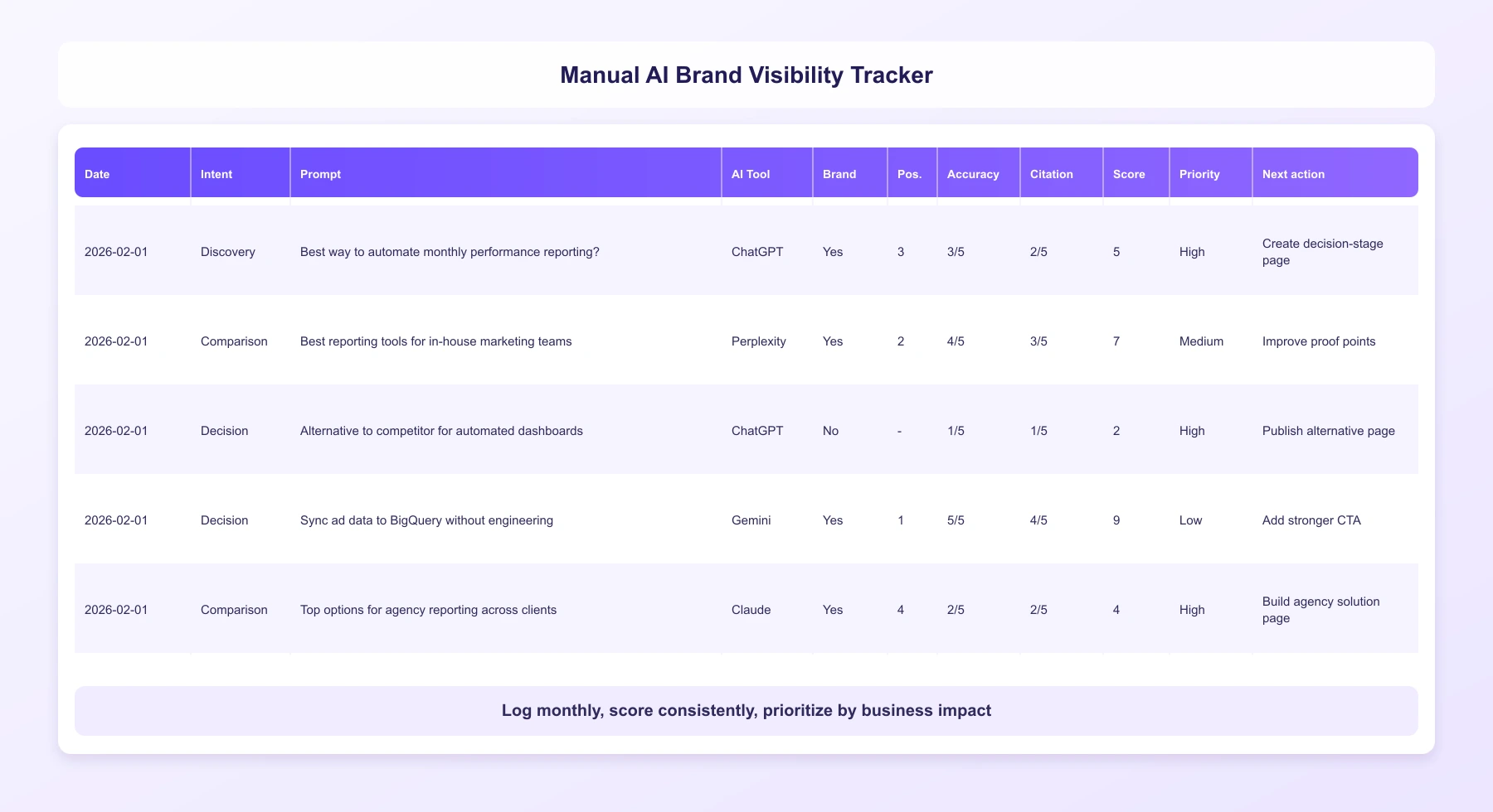 Apply a simple scoring model so all prompts are judged consistently. Then identify high-impact gaps: missing visibility on high-intent prompts, incorrect brand narrative, or citations pointing to weak pages. Prioritize fixes by business value, not by volume alone.