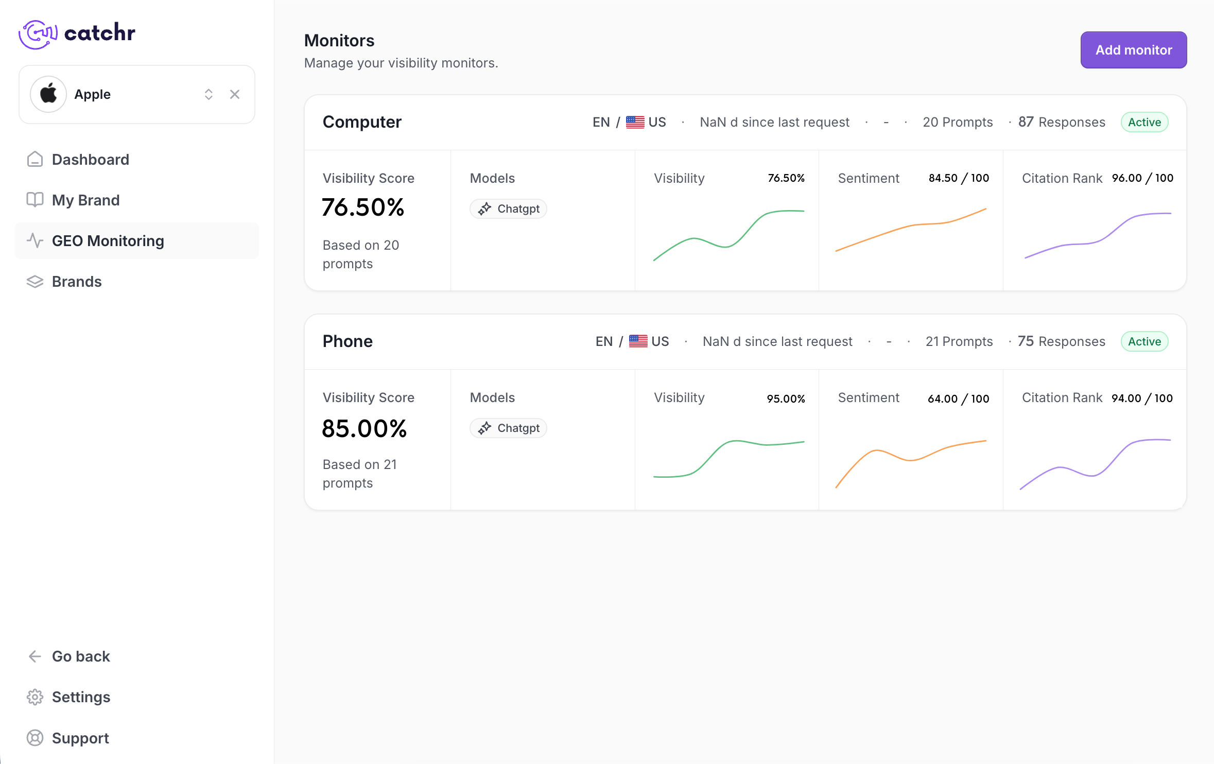 With Brand Hub GEO, each monitor is tracked as an ongoing visibility dataset, not a one-off snapshot. Catchr analyzes key signals in GenAI responses and aggregates them into a global visibility score per monitor.