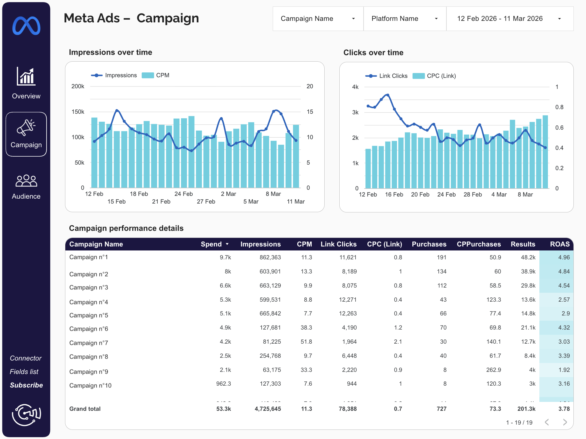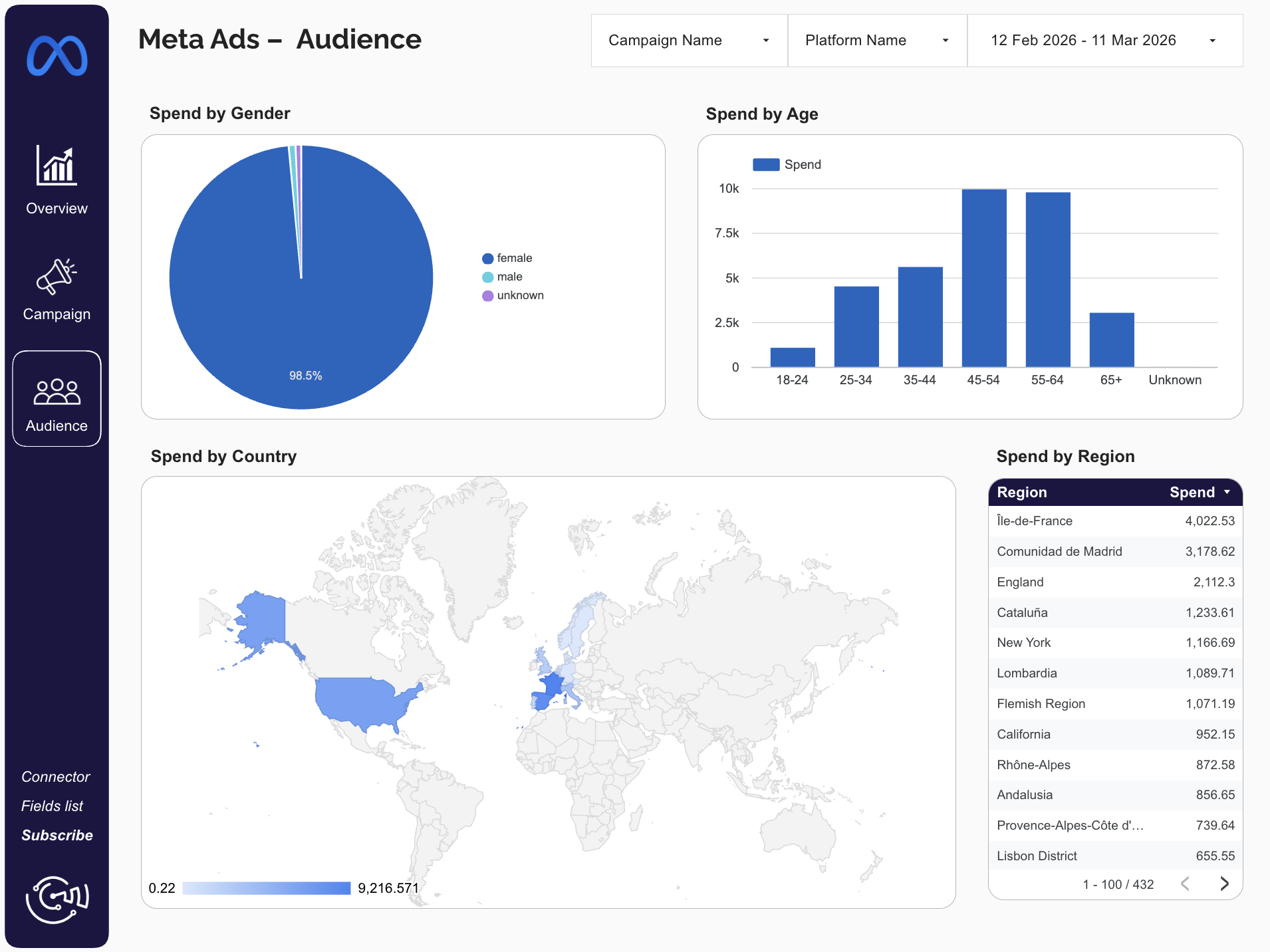 This Meta Ads template brings your key KPIs into one clear dashboard to optimize campaigns faster: spend trends, campaign-level performance, clicks, purchases, ROAS, and audience breakdowns by age, gender, country, and region. Perfect for marketing teams and agencies that want to quickly spot top-performing campaigns and allocate budget with confidence.