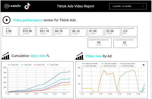 Get Insight on your video views for your Tiktok ads account thanks to this one-page report for Google Data Studio. Analyse which campaign and ads perform really well and cut the other one. Check on your video views trends and prevent any issue before it happen!