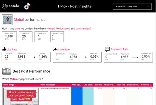 Debrief your Tiktok profile performance, see how many times your content has been seen, liked, shared and commented.