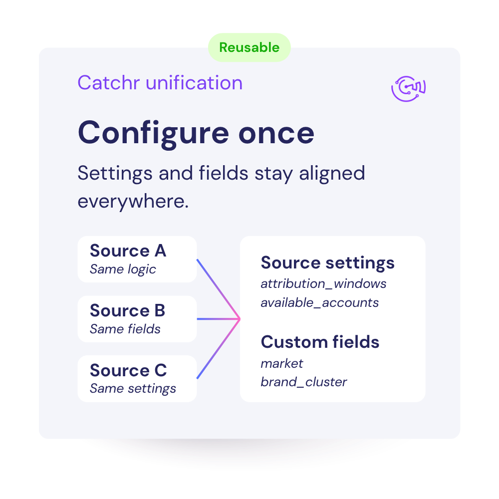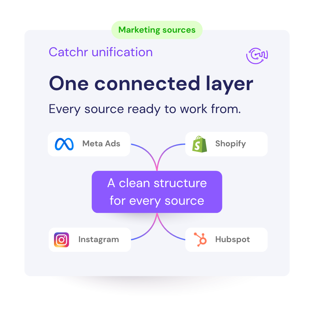 Catchr brings your marketing data into one consistent structure, so it stays clean, aligned, and ready to use across every tool. No manual fixes, no fragmented definitions, and no constant rework to keep reporting reliable.