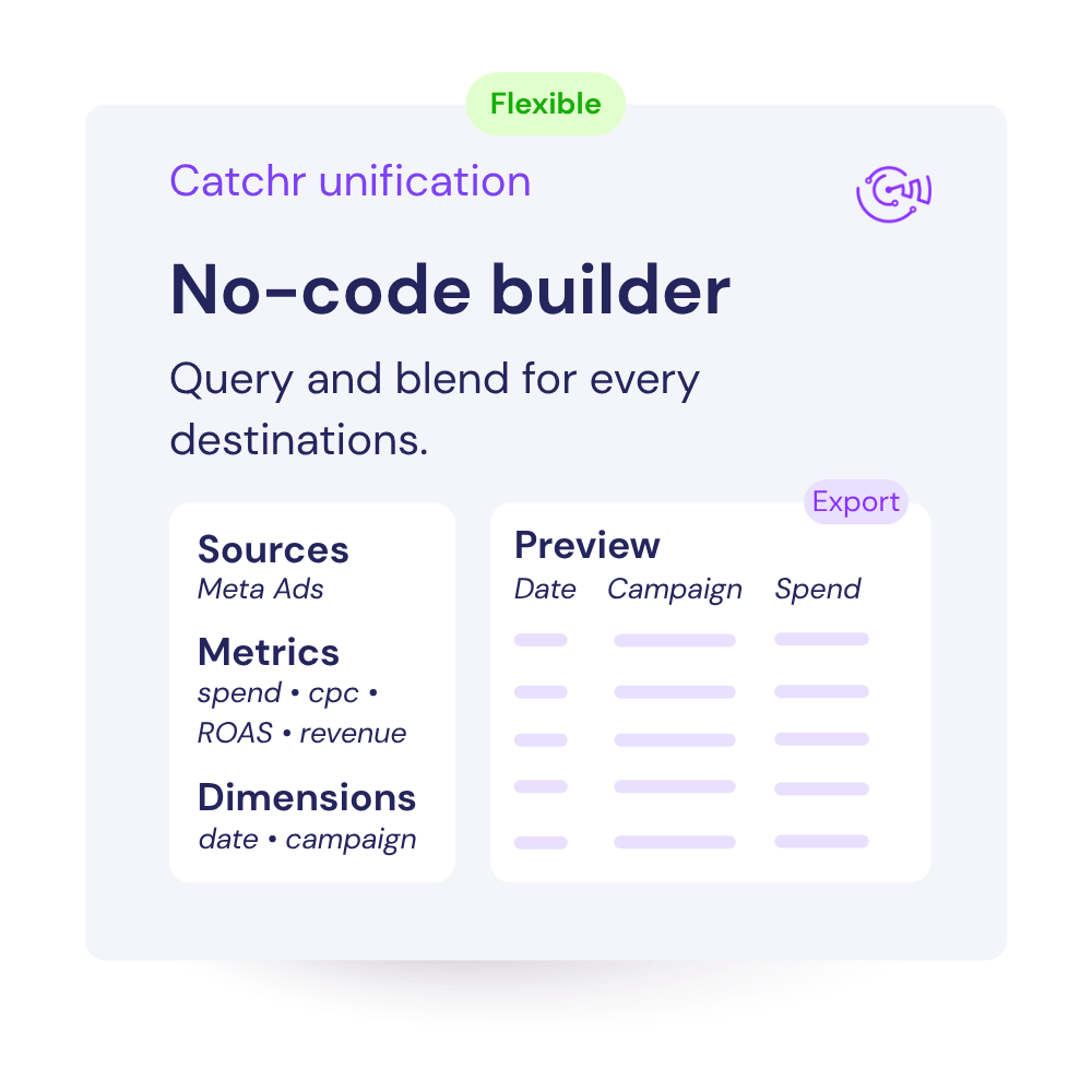 A unification layer that brings every marketing platform into a single, consistent foundation. Cleaned, harmonized data ready to flow across reporting tools, databases, spreadsheets, data lakes, and data warehouses.